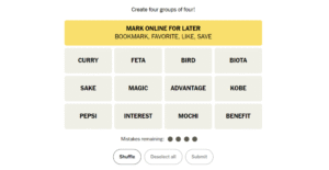 After making two mistakes and using hints, we finally completed the hardest group, which included words like “Biota,” “Feta,” “Mochi,” and “Pepsi.”