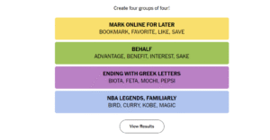 • “Mark online for later,” “behalf,” and “NBA legends, familiarly” are the remaining categories that you can fill out to complete today’s NYT Connection.
